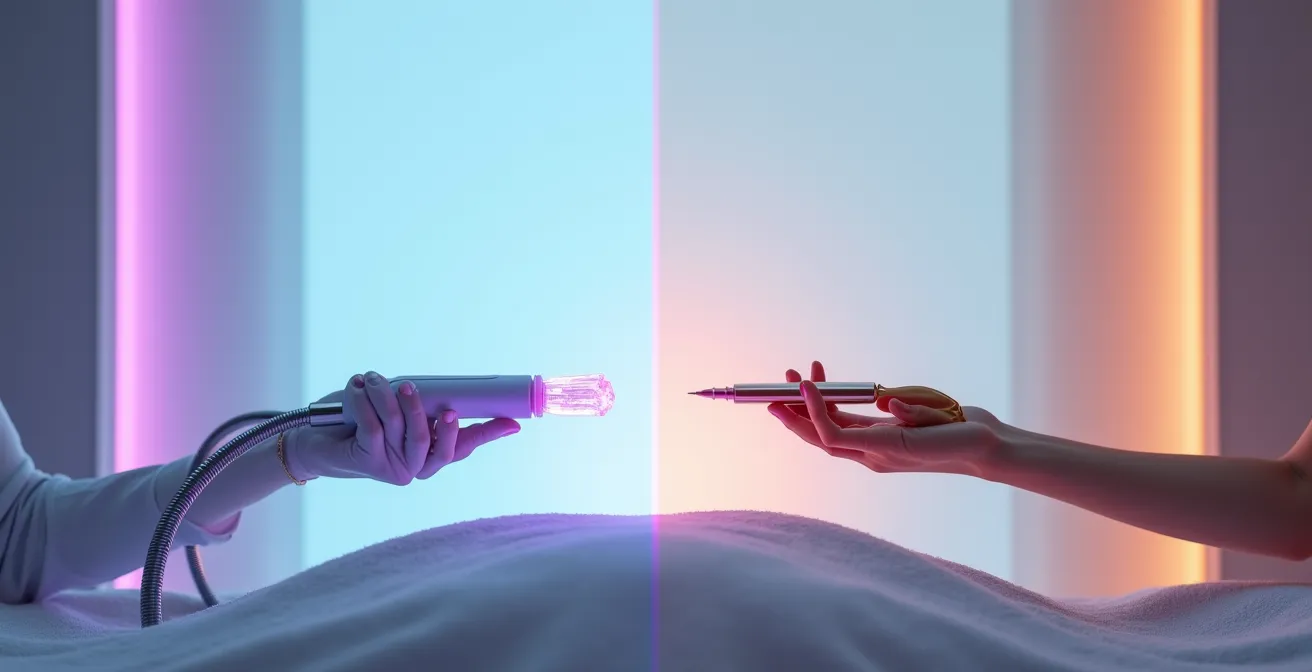 L’idée que le laser et l’électrolyse sont des concurrents est une idée reçue. En réalité, ce sont deux partenaires stratégiques. Imaginez le laser comme un outil puissant pour le « gros œuvre » : il élimine rapidement et efficacement 80 à 90% de la pilosité foncée sur de larges zones. Cependant, il laisse systématiquement derrière lui des poils résiduels : les plus fins, les blonds, les roux et les blancs, qui ne contiennent pas assez de mélanine pour être ciblés. C’est là que l’électrolyse intervient, non pas comme une alternative, mais comme une phase de finition chirurgicale. Elle offre une efficacité de 100% sur les poils blancs, blonds et roux, car elle ne cible pas le pigment, mais détruit directement le bulbe pileux.
